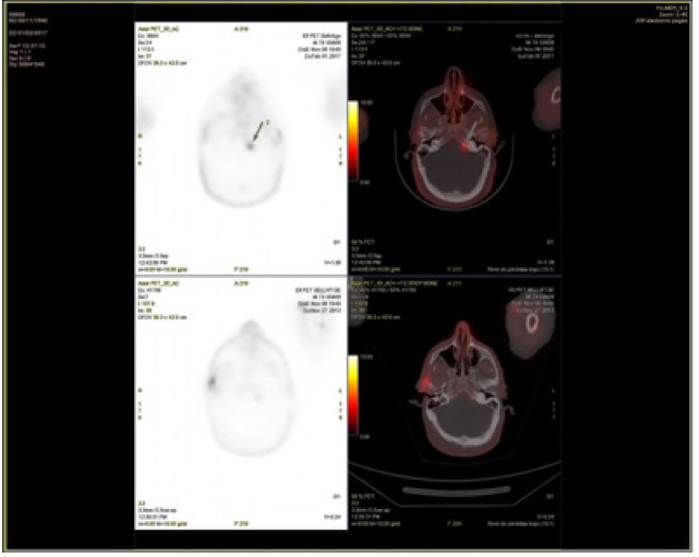 Figure 1. Hypermetabolic focus in left posterior border of clivus (SUVmax: 6,3), not evident in CT-scan, not being able to exclude metastasic disease.