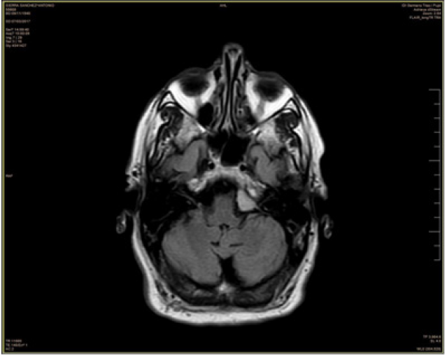 Figure 4. In MRI control, extra-axial lesion persisted. Regarding the previous study, its diameters had not changed, and the appearance of edema or other underlying bone involvement was not appreciated. No other extra-axial lesions or other relevant changes with respect to the previous study.