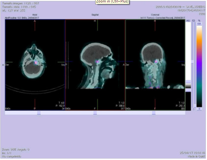 The cerebral SPECT-CT with somatostatin receptors -6.71 mCi of 111In-octreotide- identified intense focal fixation in clivus, which correlated anatomically with the finding of the brain PET-CT and MRI, suggesting the presence of a lesion with overexpression of somatostatin receptors, compatible with meningioma (Figure 3).