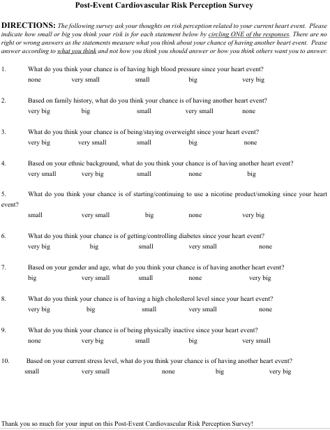 This was a cross-sectional descriptive study. The purpose of this study was to test the validity of the revised Post Event-Cardiovascular Risk Perception Survey (PE-CRPS) among patients who had a post cardiac event defined as a positive history of heart disease.