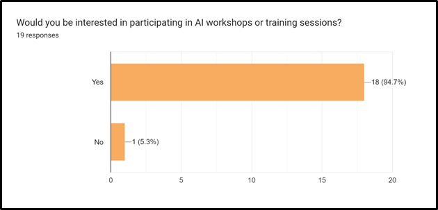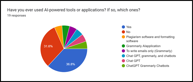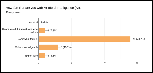 Based on survey responses, 14 out of 19 respondents (73.7%) indicated familiarity with Artificial Intelligence (AI). A smaller proportion, 5.3%, had heard of AI but needed to be more particular about its specifics. Additionally, 15.8% of the respondents demonstrated an elevated level of knowledge regarding artificial intelligence.
