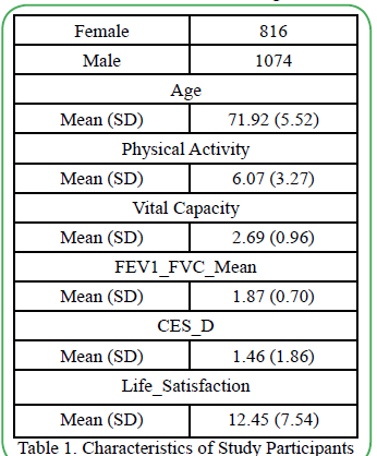 The Center for Epidemiologic Studies Depression Scale (CES-D) was used to assess mental health. The CES-D is a standard scale for evaluating depressive symptoms using the total score of responses to each question item [17]. Life satisfaction was evaluated using the total life satisfaction score in wave 6. Physical activity was measured based on the exercise frequency collected in wave 6, and weekly physical activity levels were evaluated. Indicators of respiratory function included VC% and FEV1/FVC. These respiratory indicators are essential markers of physical health in older adults.