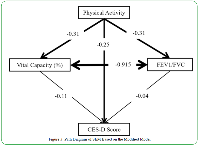 Next, a model was constructed with added error covariances between VC% and FEV1/FVC based on modification indices to improve the fit. The path coefficients for this model after introducing the modification indices are presented (Figure 1 and Table 6). This modification greatly improved the fit, with a CFI of 0.950 and RMSEA of 0.051, indicating that the revised model fit the data well (Table 7). In this modified model, physical activity continued to show a significant effect on CES-D scores (β = 0.149, p < 0.001), suggesting a potential contribution to improved mental health. However, the effects of VC% and the FEV1/FVC ratio on depressive symptoms remained insignificant, with no association between respiratory function and depressive symptoms (Figure 2). Nonetheless, the significant improvement in model fit indicates that introducing error covariances provides a more reliable representation of the relationships among the variables (Figure 3).