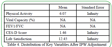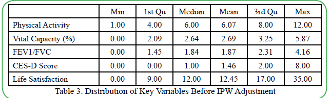 Analysis of the correlations among variables revealed various correlations between physical activity, respiratory function, depressive symptoms, and life satisfaction (Table 2). Detailed analyses of the relationships between these factors were conducted based on these correlations. Examination of the distribution before and after IPW application confirmed that the distribution of major variables became more consistent after the application (Tables 3 and 4).