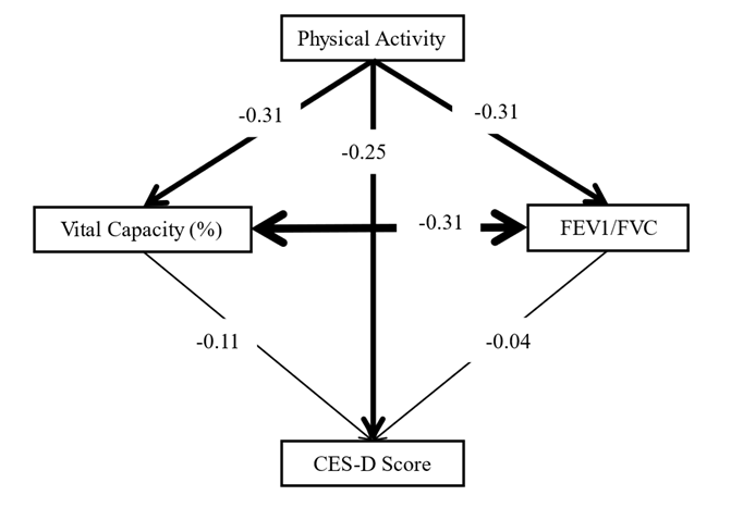 SEM was used to examine the causal relationships between physical activity, respiratory function, life satisfaction, depressive symptoms and their interactions. First, a simple model without error covariances was constructed, hypothesizing that physical activity directly affects depressive symptoms and life satisfaction, and included both VC% and FEV1/FVC to investigate the association between respiratory function and mental health.