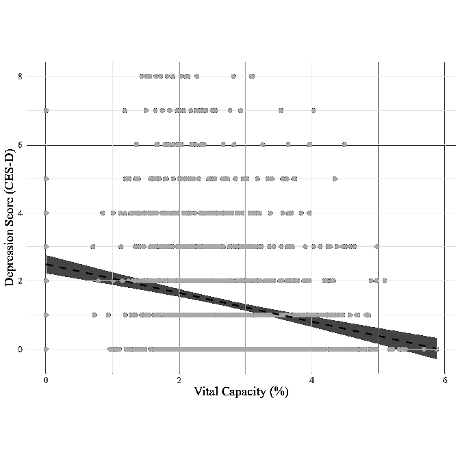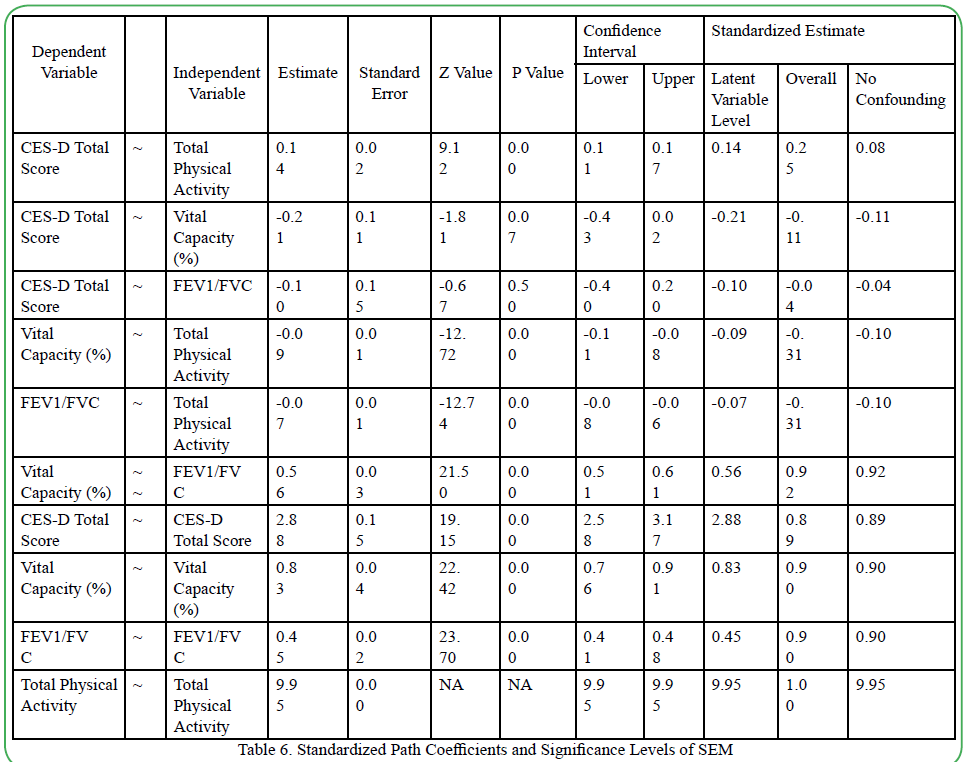 This study also discusses the theoretical basis for model improvement through the addition of error covariance. By adding error covariances between VC% and FEV1/FVC, the model fit was significantly improved (CFI = 1.000, RMSEA = 0.000). This improvement suggests that VC% and FEV1/FVC ratio may be affected by shared measurement errors or latent external factors. The correlation between respiratory function indicators is likely because some indicators are physiologically related to others; however, the extent to which these factors influence depressive symptoms remains unclear. Therefore, integrating multiple respiratory function indicators may allow for a more comprehensive analysis of their impact on depressive symptoms. Future studies should explore the influence of physiological characteristics and measurement errors on respiratory indicators using multiple indicators to clarify the mechanisms affecting mental health.