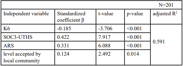 Table 3. Pearson’s correlation coefficient between PRS, K6, SOC3-UTHS, ARS, and level accepted by local community