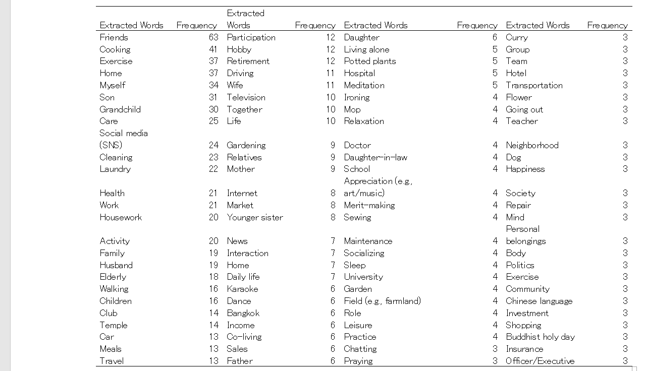 Table 2 shows the most frequently used words. The top words included "friends" (63 occurrences), "cooking" (41 occurrences), "exercise" (37 occurrences), "home" (37 occurrences), "myself" (34 occurrences), "son" (31 occurrences), "grandchild" (30 occurrences), "care" (25 occurrences), and "SNS" (24 occurrences). Examples of how these words were used are provided in Table 3 for KWIC concordance.