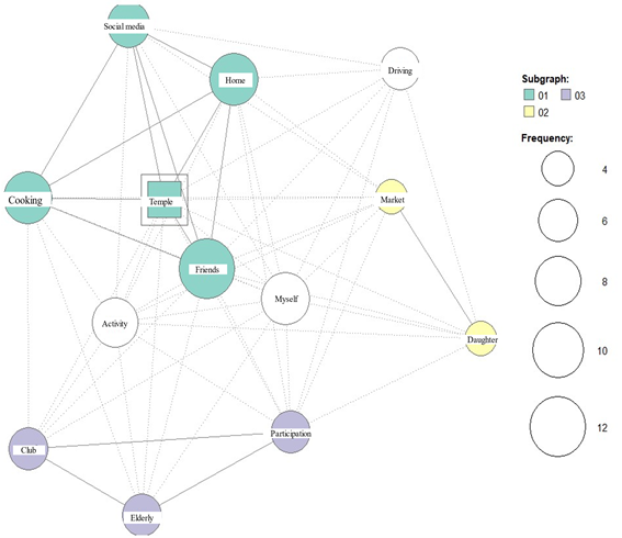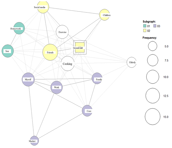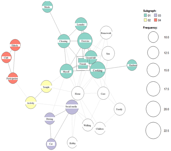 The frequently occurring word "friends" was central in the cooccurrence network (Figure 2). It was observed to have relationships with "myself," "cooking," "cleaning," and "grandchild care." Activities like "grandchild care" and "temple visits" were particularly notable, as they did not frequently appear in previous interviews conducted in Japan.
