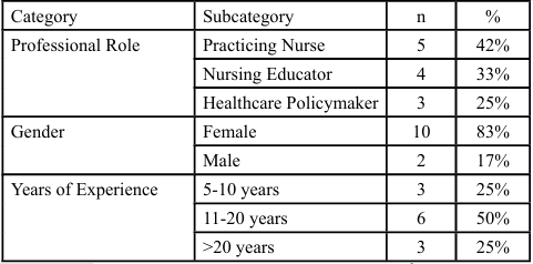 The research will reveal several critical findings such as participant and document demographics Semi-structured interviews were conducted with 12 key informants (see Table 1). The analyzed documents (n=15) included the Bahrain Vision 2030 implementation plan, the National Health Regulatory Authority (NHRA) [9] 2023 Annual Report, nursing curricula from all three national universities, and Supreme Council of Health committee reports from 2020-2023.