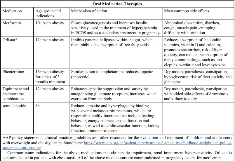 In 2023, the American Academy of Pediatrics (AAP) updated its clinical practice guidelines for obesity in children. The Clinical Practice Guideline for the Evaluation and Treatment of Children and Adolescents With Obesity includes and executive summary and treatment algorithm clarifying pediatric obesity’s designation as a complex, chronic disease, while creating a concise pathway for long term treatment and support. The chronic disease model allows for a holistic view, taking into account developmental status, environment, family dynamics and history, co-morbidities and socioeconomic challenges. Long-term treatment plans should include family input, and services such as cognitive behavioral therapy and medical monitoring [14]. However, therapies have expanded, with a variety of treatment options that now include pharmacologic therapies (Table 1, 2) and non-pharmacologic therapies.