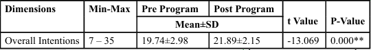 Results: Revealed that 48.8% of the studied females had insufficient income, and 59.3% were rural residents. After program implementation, 86.5% had moderate intentions which is higher as compared to 77.5% who had moderate intentions pre-program. A highly significant statistical differences between overall intentionspre and post program implementation (P=0.000).