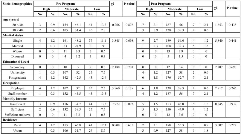 Table 3: Relation between studied working females’ socio-demographic characteristics and their intention levels through program phases (n=334).