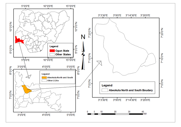 This study was conducted in Abeokuta, Ogun State, Nigeria. Abeokuta is a capital city located in the south-western part of Nigeria. It lies on latitude approximately located within latitude 7˚0'0 N and 7˚ 20' 0 North of the equator and 3˚0'0 E and 3˚20'0 East of the Greenwich meridian [18]. The study area is strategically located between major towns and cities such as Lagos, Ibadan, Ijebu-Ode, Sagamu, Sango Ota, Papalanto and Ilaro. The study area is about 81km south-west of Ibadan; the capital of Oyo State and 106km North of Lagos State. (See figure. 1). Abeokuta is an essential commercial hub renowned for its rich history and cultural heritage. The city's strategic location and historical significance have contributed to its steady population growth and urban expansion. Consequently, Abeokuta faces considerable housing challenges, including inadequate housing stock, poor infrastructure, and inefficient management of public housing estates [19,20]. Abeokuta's public housing landscape comprises various estates managed by state and federal agencies, including the Housing Corporation, Property Development Corporation, and Federal Housing Authority. These agencies are responsible for planning, developing, and managing housing estates to address the needs of the low-income population. However, the rapid urbanization and population increase have strained these public housing estates, leading to issues such as overcrowding, inadequate maintenance, and substandard living conditions [21].