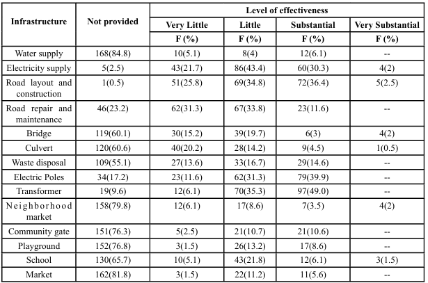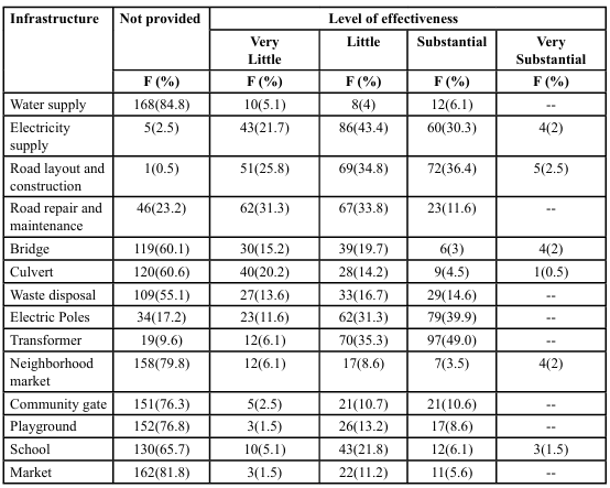 It was established in this study that majority of the respondents rated government administration and management of public housing estate as fair within the estate. Also, on the planning and layout of the housing estates, it was discovered that government efforts in this regard were rated as being fair in the study area (Abeokuta). Similarly, the effectiveness of the earlier identified infrastructural facilities was provided in Table 9, it was established that water, bridge, culvert, waste disposal, community gate, playground, school, market, and neighborhood market were not publicly provided by government intervention, community service or any other institutional means rather it was privately provided and this made the respondents mostly rated it as, not provided. Electricity, and road repair and maintenance were majorly rated by respondents as being little in their effectiveness while electric poles, transformers, road layout and construction were rated as being substantial in their effectiveness.