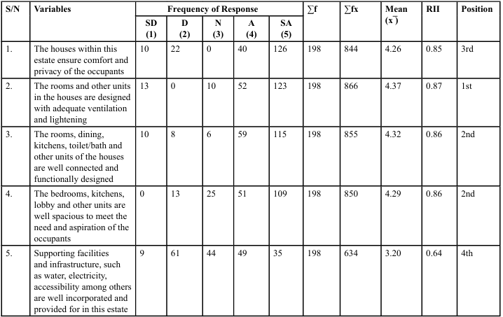 This expression showed that formula for the computation of RII, such that ∑fx represents weighting assigned to each of the identified variables. The A in the equation represented the highest rating of respondents’ response on five-point Likert Scale (i.e. 5 to 1) employed in Questionnaire administration while the N represented total respondents. Thus, the five Likert scale of ratings were assigned numerical values of 1,2,3, 4, and 5 respectively. The numerical value was transformed into 0.2 (1/5), 0.4 (2/5), 0.6 (3/5), 0.8 (4/5), and 1.0 (5/5) respectively for 0 ≤ RII ≤1. Consequently, the analysis evolved into relative importance index (RII) that ranged from 0.64 ≤ RII ≤ 0.87 and this indicated that majority of the respondents strongly agreed on the identified variables in Table 10 with the exception of the last variable with RII= 0.64 which indicated that the respondents were Neither agree nor disagree about the variable. Hence, the respondents strongly agreed that the housing estates were designed with comfort and privacy; adequate ventilation and lightening; the dining, kitchens, toilet/bath and other units of the houses are well connected and functionally designed; and bedrooms, kitchens, lobby and other units are well spacious to meet the need and aspiration of the occupants. While the respondents were Neither agree nor disagree if supporting facilities and infrastructure, such as water, electricity, accessibility among others are well incorporated and provided for in this housing estates in the study area.