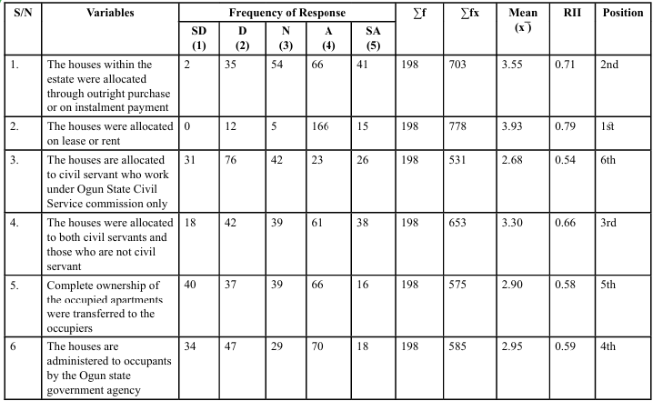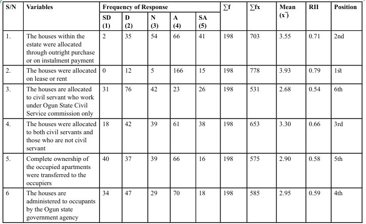 However, on the planning and management of the estates, it was established that majority of the respondents strongly agreed that the houses were allocated on lease or rent and that houses within the estate were allocated through outright purchase or on instalment payment (as RII ≥ 0.71). While most of the respondents agreed that the houses were allocated to both civil servants and those who are not civil servant (RII= 0.66). While all the respondents were Neither agree nor disagree with other variables whose RII ≤ 0.59 (Table 10).