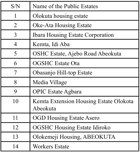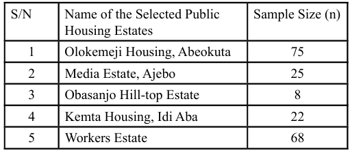 Multistage sampling was adopted for this study. The stage involved identification of all the public housing estates in Abeokuta, Ogun state Nigeria (Table 1). The second stage of sampling technique involved adoption of sampling method to select five public housing estates based on principle of homogenous model to avoid repetition (Table 2). The third stage involved the stratification of respondent based on the categories of selected public housing estates. Similarly, based on homogenous population model 198 respondents were samples using snowball approach through online questionnaire administration. However, due to the low turnout at earlier stage of the online questionnaire administration with the request of some of the estates’ residents to have printed copies of questionnaire, field survey was embarked on to complement the online survey. Hence, 198 copies of questionnaire were administered to the selected estates.