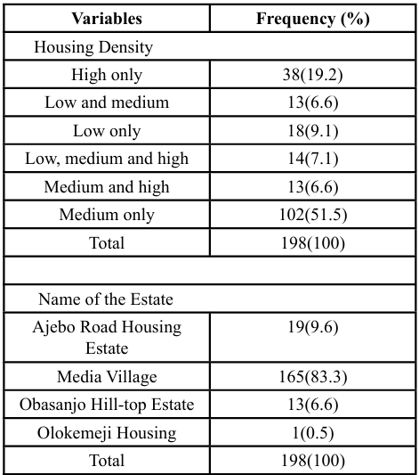 The socio-economic attributes of the respondents are provided in Table 3 with the results of the analysis. Prior to the socio-economic characteristics, the density of the housing units is indicated. It was discovered that the majority of the housing units within the public housing estates were of medium density, accounting for 51.5% (102) of the respondents. Next in magnitude was 19.2% (38) of the respondents who lived in high-density units, while the remaining 29.3% lived in a mix of low, medium, and high-density housing combinations. Also, of all the four public housing estates surveyed, respondents living in Media Village accounted for 83.3% of the total respondents, while others resided in Ajebo Road Housing Estate, Obasanjo Hill-top Estate, and Olokemeji Housing.