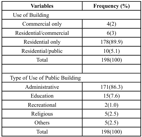 Table 4 presents information on the attributes and elements of the buildings occupied by the respondents within the estates. It was discovered that majority of the respondents used the buildings they occupied within the estate for residential use and this accounted for 89.9% (178) of the total respondents. While others utilized the occupied buildings of the estate for commercial only, residential and commercial, and residential and public. Also, majority of the respondents indicated that their public buildings within their various estates were used for administrative use (86.3%) while the lowest respondents indicated that theirs were used for recreational use (1%) and others indicated that theirs were used for education, religions and others which jointly accounted for 12.6%. Also, on building types, it was discovered majority of the respondents indicated that their occupied building types were majorly 2-bed room flat and 3-bedroom flat which accounted for 46.9% and 35.9% respectively. On number of floors, all the respondents indicated varied number of floors which ranged from one to eight and others while the proportion that indicated others accounted for largest. Besides, majority of the buildings within the selected estates were indicated to have between one to two rooms, offices and shops. On the buildings ages, it was established that majority of the buildings within the estates were 11 to 30 years and accounted for 80.3%. Also, findings indicated majority of the respondents who were residents of the various selected housing estates were on private renting and this accounted for 55.1%.
