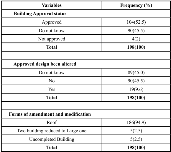 Findings revealed that 52.5% of the respondents indicated that their housing estates got building approval while only 2% of the total respondents indicated that their housing estates had no approval for buildings within the estates. Similarly, 45.5% of the total sampled population indicated that their estates did not alter their building design after the approval before the construction. However, 94.9% of the total respondents indicated that only roof renovation was the only form of amendment done within their estates after the construction. Similarly, 33.8% of the total respondents indicated that their estates procured or had certificate of occupancy while majority of the respondents indicated that they were devoid of such knowledge and this accounted for 52.1% and 14.1% indicated that theirs had no certificate of occupancy. Also, it was discovered that majority of the housing estates had no approval from town planning authority and this accounted for 78.8% while only 21.2% procured their approval from town planning authority as indicated by the respondents.