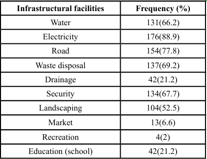 The public infrastructural system within the estate was investigated and ten infrastructural facilities were identified within the estates. It was established that there was proliferation of some public infrastructural such as water, electricity, roads, waste disposal, security, and landscaping, as majority of the respondents indicated the availability of these infrastructural facilities in their residing public housing estate (Table 6). It was established that infrastructure like market, education, drainage, and recreation were not profound in the selected estate and this accounted for lower proportion of the respondents that indicated their availability.
