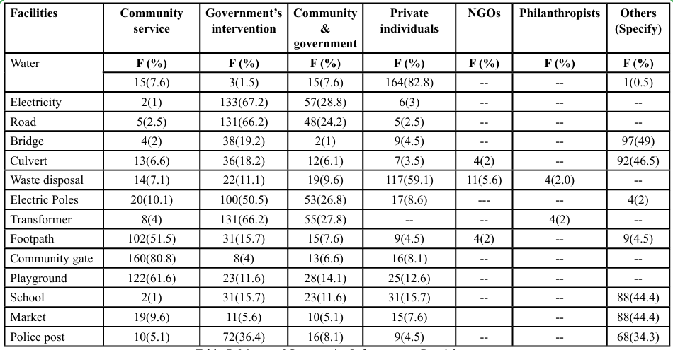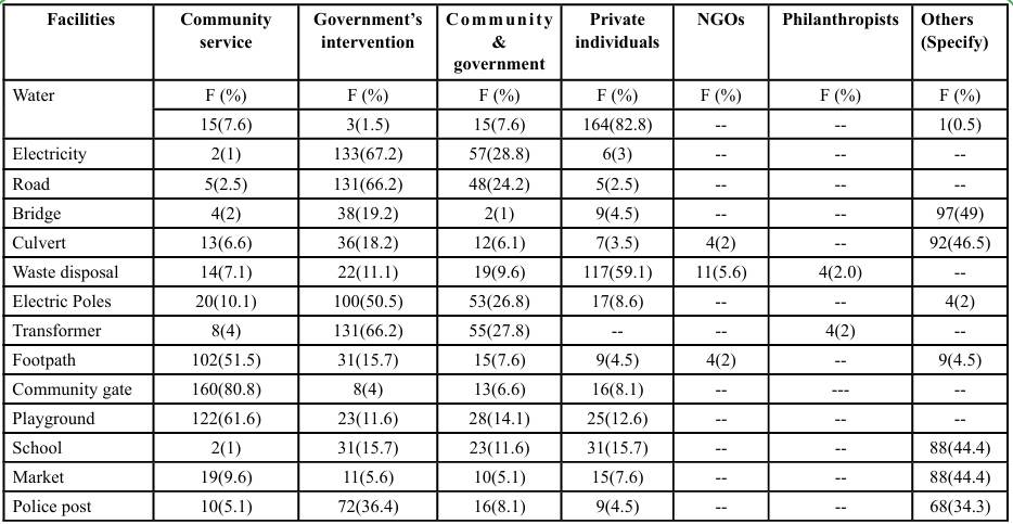 Furthermore, Table 7 presents information on the way to which the community infrastructure within the housing estates is provided in the selected estates in Abeokuta. It was established that water was majorly provided by the private individuals, as indicated by 82.8% of the respondents. While few of the public housing estates sampled had their water facility or infrastructure being provided by community service, and community and government which jointly accounted for 7.6% each. The electricity and roads in the estates were majorly provided through government intervention and these were indicated by 67.2% and 66.2% of the total respondents. Similarly, waste disposal was provided by private individuals (59.1%) while the electric poles and transformers within the estates were provided by government intervention and these accounted for 50.5% and 66.2% respectively. Besides, it was established that most of the footpaths, community gates, and playground were provided through community service. However, majority of the respondents indicated that some infrastructure like bridge, culvert, market and schools were provided from other means.