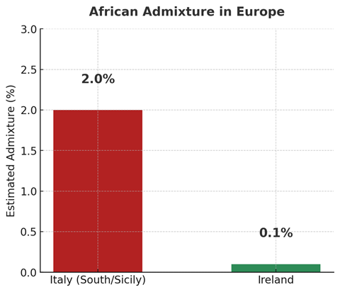 The evidence reveals a spectrum of Afro-European connectivity. Southern Italians and Sicilians exhibit modest but consistent African-linked signals across multiple genetic markers, ecological contexts, and historical layers. Ireland, by contrast, exhibits slight African admixture at the population scale, with most African lineage emerging through recent migration and social networks rather than deep genetic inheritance.