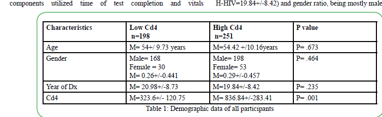 Table 1 depicts the demographic outlines of the participants in the current study. The examined data in this investigation were collected from 449 participants' records, and further divided into 198 for the L-HIV (Cd4=323.6+/- 120.75) and 247 for the H-HIV (Cd4=836.84+/-283.41) groups according to Cd4 values. The L-HIV and H-HIV were comparable in age (L-HIV=54+/ 9.73 and H-HIV 54.42 +/10.16year), years of diagnosis (L-HIV=20.98+/-8.73 and H-HIV=19.84+/-8.42) and gender ratio, being mostly males.
