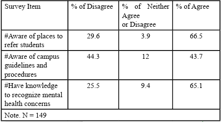 In summary, this study revealed most faculty respondents had referred a student in the past to a mental health professional (78.5%), felt they had sufficient knowledge of mental health concerns (65.1%), and were aware of several places to refer students (66.5%). Also, faculty members prefer mental health education through workshops (64.4%) and written literature (53.7%). Further analyses showed one fourth (25.5%) of respondents did not feel they were knowledgeable about mental health, over one-fourth (29.6%) indicated they were unaware of places to refer students, and almost half (44.3%) of faculty were unaware of campus guidelines and procedures to be followed when referring students.