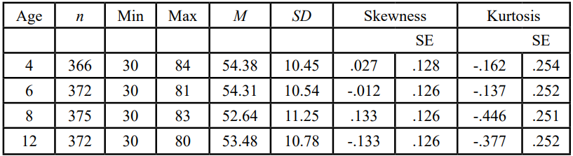 A sample of N = 376 households from the LONGSCAN dataset was targeted for the investigation. Households were included in which the caregiver/respondent was the biological mother of either a Black child or White child (male or female) from birth to at least 12 years of age. The sample included only cases where child and caregiver race matched (Black/White). Other racial categories were excluded to target Black households and White households specifically. Our analysis yielded a final sample of 376 households. Characteristics of the target sample can be found in Table A1. Overall, the sample of households was disproportionately Black (70.5%). White households appeared to be proportionately more likely to include a male child (54.1) and Black households to include a female child (54.3). The association between household race and child gender was not significant χ2(1) = 2.21, p = .137. Distributions of CBCL externalizing behavior scores were examined at each age (see Table 2A).