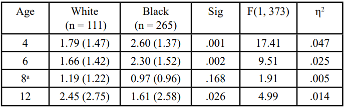 Consistent with our hypothesis, significantly more spanking was reported in Black households than in White households at ages 4 and 6. No significant differences were observed at age 8. Conversely, at age 12, significantly more spanking was reported in White households than in Black households.