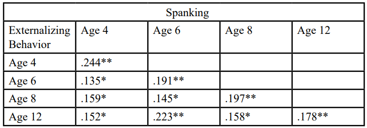 To examine the association between spanking and externalizing behavior, a series of partial correlations were run, controlling for a history of physical abuse allegations. Results are presented in Table A4. Significant, though fairly small, correlations were consistently found between spanking and externalizing behavior (r = .135 to .244). As seen in Table A4, this finding held true when the association was examined contemporaneously (e.g., age 4 spanking with age 4 externalizing behavior) and when spanking at earlier ages was associated with externalizing behavior at later ages. Although small, all of the correlations were significant, consistent with the hypothesis that spanking and externalizing behavior are positively associated.