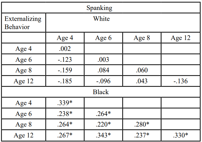 Further analysis was conducted to explore the possible direction of the relationship between spanking and externalizing behavior and to aid in our understanding of the moderating effects of household race that emerged. As already seen, spanking at earlier ages predicted (was associated with) externalizing behavior at later ages (see Tables A4 and A5), and this effect appeared to be restricted to Black households. Because the data are correlational, it is possible that externalizing behavior at earlier ages also predicts spanking at later ages. When these correlations are examined, it becomes clear that the association between earlier externalizing behavior and later spanking are, once again, restricted to Black households. As seen in Table A7, in the Black households, externalizing behavior at age 4 was associated with spanking at ages 6, 8, and 12. Externalizing behavior at age 6 was associated with spanking at ages 8 and 12, and so on. No such associations were observed in the White households.