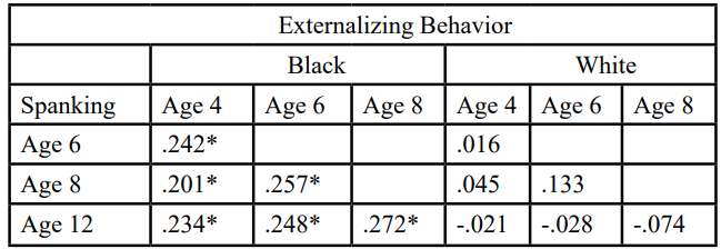Bivariate correlations between spanking and externalizing behavior were also examined separately in the Black households and White households (see Table A5). When this was done, significant correlations were consistently obtained in the Black households (r = .220 to .339) but not in the White households where no significant correlations were obtained (r = .002 to -.185).