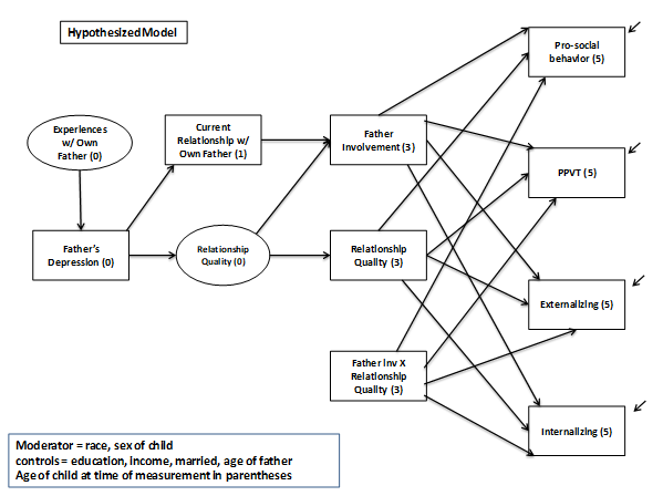 The hypothesized model for the current study (Figure 2) is an adapted version of Belsky’s [4] process model for parenting, in which we examined how fathers’ developmental history with their own biological fathers (level of paternal involvement during childhood), current father-son relationship quality, psychological well-being (depression), and intimate relationship quality affect father involvement and intimate relationship quality. In turn, we examined the indirect effects of these relationships on child outcomes (language skills, pro-social, internalizing, and externalizing behaviors) via father involvement. Due to the differential influences ethnicity on father involvement that have been found in the literature [15-18], race served as a moderator for the current study. Data from the Future of Families and Child Wellbeing study was utilized to examine the long-term effects important contextual factors – relationship quality and paternal depression – experienced postpartum (when fathers’ children were born) on father involvement at age three and children’s language skills (PPVT scores), pro-social, internalizing, and externalizing behavior at age five. Furthermore, intergenerational fathering was examined in this framework to provide a possible historical explanation for contemporary fathering practices.