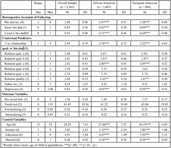 Table 1: Study variables means, standard deviations in the whole sample (N = 3,301) and in the sub-samples of African American (n = 2,407) and European American fathers (n = 894).