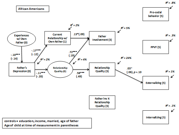 Overall, the current study adds to the literature by demonstrating intergenerational effects of fathering on child outcomes – specifically children’s pro-social, internalizing, and externalizing behaviors. It appears that past experiences with one’s father may have implications for adult psychological distress, and in this case, paternal depression. Furthermore, paternal depression negatively affects fathers’ current relationship quality with their own fathers, but this appears to only be true for African American fathers. In addition, fathers’ current relationship quality with their own fathers has positive bearings on their levels of father involvement. The most robust finding was observed for the positive effects of intimate relationship quality when children are newborns on father involvement when children are 3 years old. Therefore, intimate relationship quality experienced after the birth of a child has implications for father involvement during toddlerhood. This finding corroborates a wealth of previous research demonstrating positive spillover effects for high quality intimate relationship functioning on father involvement [49-52].