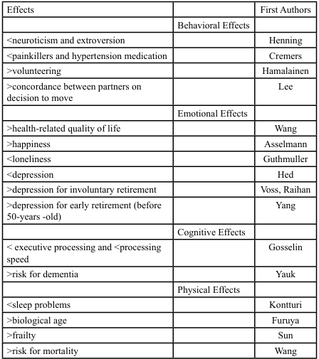 Positive behavior effects of retirement appeared in this current literature. They included a reduction in neuroticism and extroversion, a reduction in the use of medications, an increase in volunteering and concordance between spouses on moving their residence.