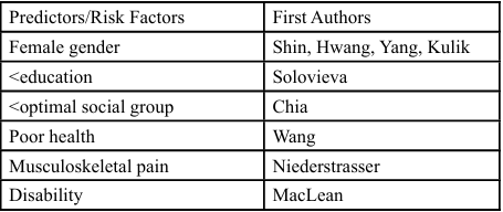 Several predictors/risk factors for retirement have been the focus of studies in this current literature. They include female gender, education, social support, poor health, disability and pain.