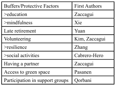 Several buffers/protective factors for retirement effects have been the focus of research in this current literature. They include education, health, mindfulness, late retirement, volunteering, social activities, having a partner and having access to green space.