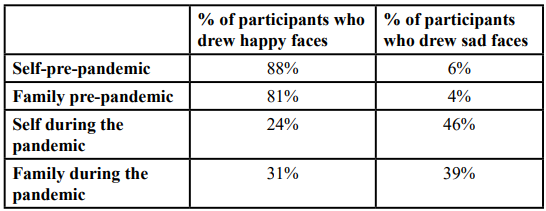 Frequencies for the types of drawings (full figure; stick figure; abstract/objects only figures; faces only) were calculated for each of the four requested drawings (Self-Pre-pandemic, Self During Pandemic; Family Pre-Pandemic and Family During Pandemic). Numbers of masks depicted were also reported across the four conditions as were numbers of happy versus sad faces. Spontaneous depictions of such items that participants included such as drawings of televisions and computer screens (e.g. “tendencies to rely on screens to communicate/get entertainment”) as well as other objects were noted. Frequencies of figures and objects drawn were calculated by rater pairs with 100% reliability.