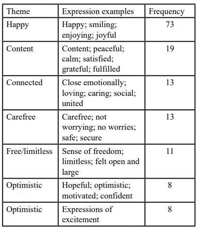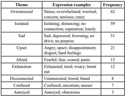 Drawings of happy faces produced for Self and Family before and during COVID-19 were dramatically different, with happy faces drawn primarily for pre-pandemic depictions and sad faces drawn more for during the pandemic representations. Ubiquitous expressions of isolation and negative affect (See Table 4) were associated with SD and FD. However, a couple of outlier responses referenced greater happiness during the pandemic. Some reasons for that alluded to by participants included their having increased time with family, an ability to work from home and/or their tendency toward social anxiety. Several participants also noted attitudes of resiliency and optimism in their strategies for coping with the COVID-19 pandemic.