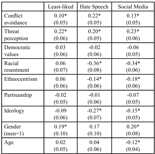 Support for government censorship of the respondent’s least-liked group is correlated with conflict avoidance. The conflict avoidance coefficient is positive and statistically significant indicating that people who have little appetite for conflict are more likely to support censorship by the government. Moreover, the coefficient estimate suggests the effect of conflict avoidance on support for censorship is about half of the size of the threat variable, which many view as the most important factor that drives political intolerance [5]. Racial resentment and ethnocentrism show no relationship with censorship in this context. This is consistent with existing studies using the least like methodology and likely due to the questions asking about many groups that lack racial content.