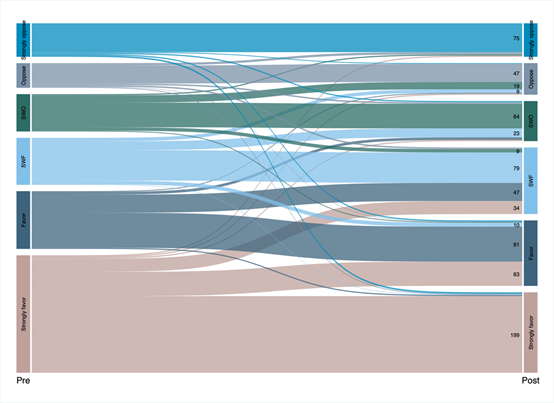 Figure 1 shows the movement from people’s initial response (pre) and their response after given a counterargument (post). Although most people stay in their original position, there is movement across categories. For instance, 63 respondents with the most intense or hardened initial response move from the “strongly favor” category into the “favor” category after a counterargument suggesting censoring hate symbols would be ineffective. Another 34 move into the “somewhat favor” category, while another 30 moves into one of the three oppose responses. The most movement comes from respondents initially responding that they “somewhat favor” the ban who give a “somewhat oppose” or “oppose” response after the counterargument. Overall, 32% of respondents changed at least one category following the counterargument with only 5% of respondents experiencing a backlash against the counterargument. Of those experiencing a backlash, further probing shows it is equally common among those that initially favor the ban (5%) as it is among those initially opposing the ban (5%).