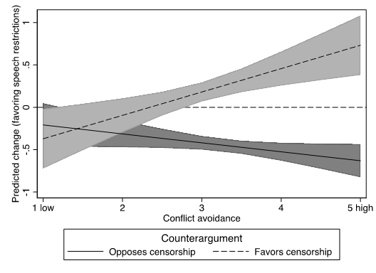 The results also shed new insight into attitude change. There is evidence that conflict avoidant personality types are more likely to express a change in their attitude when given a counterargument to their initial opinion. The least conflict avoidant types receiving the counter-attitudinal argument in favor of censorship demonstrated a slight backlash. The desire to engage rather than avoid conflict might help explain why some people experience a backlash in political discussions more broadly---an explanation that has eluded scholars [35,36]. One remaining puzzle from this study is the extent the observed attitude change represents real attitude change or merely an expressed preference meant to quell conflict. Theoretically, the latter seems more plausible given that the goal of conflict avoidant people is to eliminate the immediate conflict. But the willingness of conflict avoidant people to support censorship---which seems like a permanent solution---might suggest enduring attitude change.