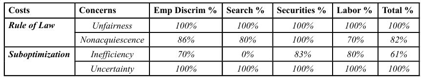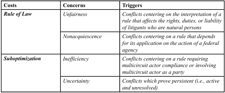 All of the unresolved conflicts suggest rule of law costs—with each triggering the unfairness concern and 82 percent triggering the nonacquiescence concern. Similarly, all of the unresolved conflicts suggest suboptimization costs—with each triggering the uncertainty concern and 61 percent triggering the inefficiency concern. See Table 3.
