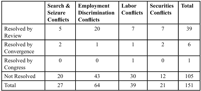 Of the 27 search and seizure conflicts, 7 were resolved—5 by Supreme Court review and 2 by convergence of the circuits. Of the 64 employment discrimination conflicts, 21 were resolved—20 by Supreme Court review and 1 by convergence. Of the 39 labor conflicts, 9 were resolved—7 by Supreme Court review, 1 by convergence, and 1 by the revision of a statute by Congress. Finally, of the 21 securities conflicts, 9 were resolved—7 by Supreme Court review and 2 by convergence.
