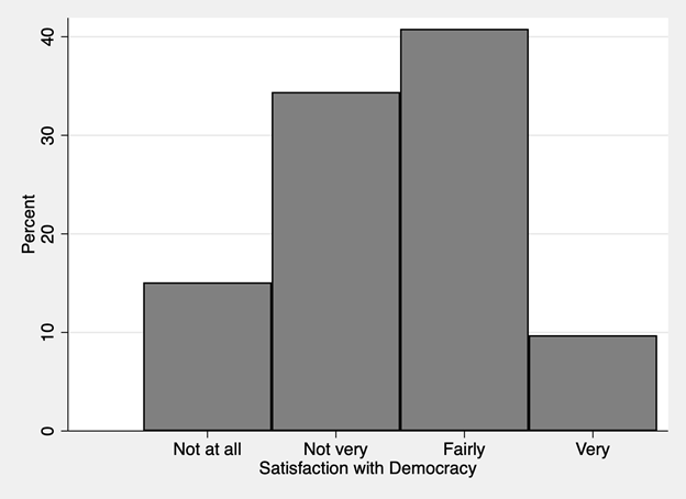 I use the following question from the CSES to measure Satisfaction with Democracy: “On the whole, are you very satisfied, fairly satisfied, not very satisfied, or not at all satisfied with the way democracy works in [COUNTRY]?” I code the answers such that higher values indicate the respondent is more satisfied with democracy. I present a bar chart of the variable in Figure 1. The modal category is 3, “Fairly Satisfied.”