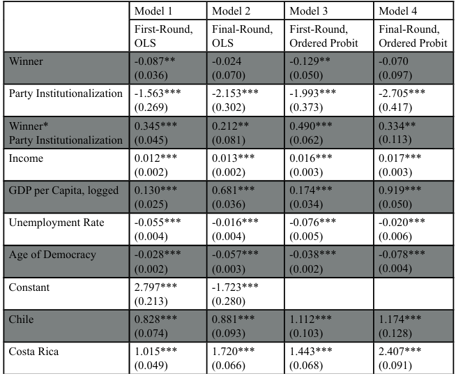 Table 1: The Impact of Winner on Satisfaction with Democracy Conditional on Party Institutionalization